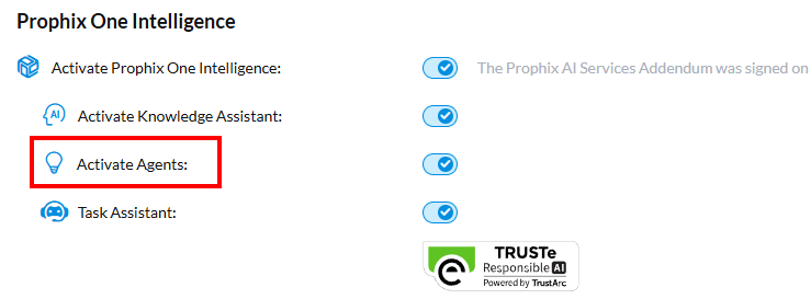 Before your organization can use Prophix One Intelligence, a Portal admin needs to enable the feature and then the AI assistants that you want to use.